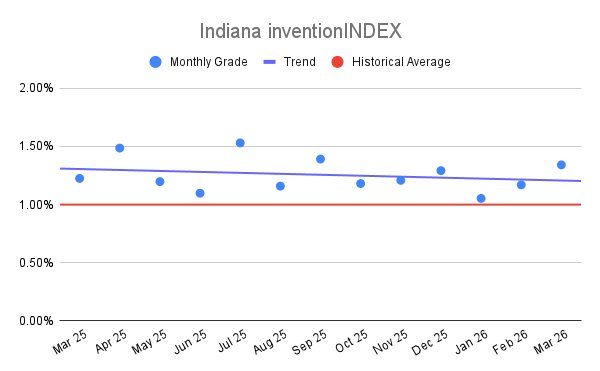 The Indiana inventionINDEX for March 2026 stands at 1.34%, earning a B rating. This figure indicates a steady and encouraging recovery throughout the first quarter of the year. After beginning 2026 with a five-year floor of 1.05% in January and a modest rise to 1.17% in February, the current score suggests that the state has successfully regained its footing. While the B rating is a significant improvement over the C-tier performance of the previous two months, it still reflects a cautious transition period as the state works to return to the higher performance levels seen late in 2025.